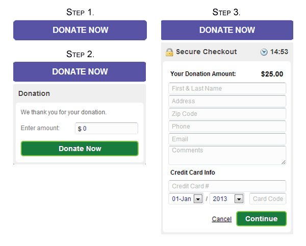1. Global Donation Widget: We have created a streamlined donation button that you can add anywhere on your website solely for the purpose of online donation collection. The cool part is you never leave the page, the donation is SSL layer secure, and it takes three steps! Your patrons press the “Donate Now” button, they enter an amount and then enter their billing information.